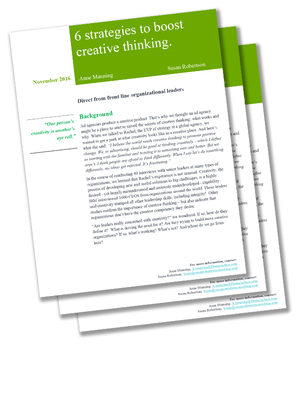 Fill out this form to get our white paper on creative thinking. Get the inside story on what other organizational leaders think and feel about creative thinking. This papers summarizes findings from 40 interviews with executives and leaders in organizations like yours and shares the “lessons learned”.